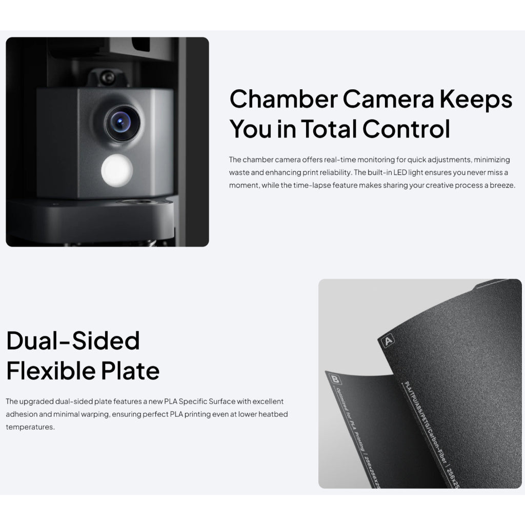 > Other features: sensors, chamber monitoring camera, filament runout sensor, power loss recovery